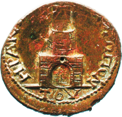 lighthouse with three tiers and arched entrance; on top, fire beacon