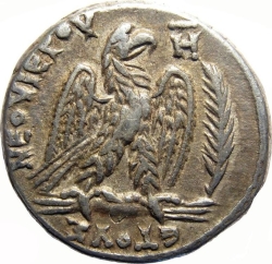 eagle with wings spread on thunderbolt to left, head right, with wreath in beak; in right field, palm branch