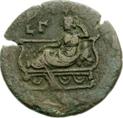 Tyche reclining on couch, left, wearing kalathos, resting hand on rudder
