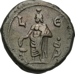 Sarapis as fountain-god standing, left, wearing kalathos, holding taenia(?); before, lebes on stand; behind, standard