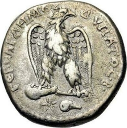 eagle standing on leg and thigh of animal, facing, head, right, spreading wings; in exergue, star and ram's head, right
