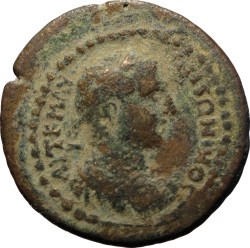 temple with four columns enclosing cult statue of Zeus Laodiceus standing left, holding eagle and sceptre; at his feet, left, altar