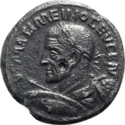 laureate, draped and cuirassed bust of Maximinus, left, seen from rear, holding spear and decorated shield