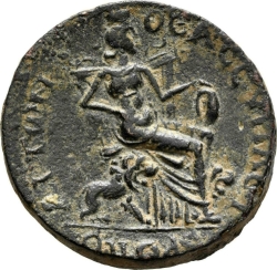Atargatis seated on throne between two lions, left, wearing kalathos, holding tympanum and leaning elbow on throne