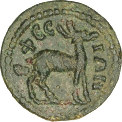 Tyche standing, left, wearing kalathos, holding cult statue of Artemis Ephesia and cornucopia