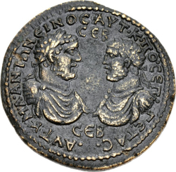 confronted busts of Caracalla, laureate, draped and cuirassed, right, seen from rear, and of Geta, laureate, draped and cuirassed, left, seen from front