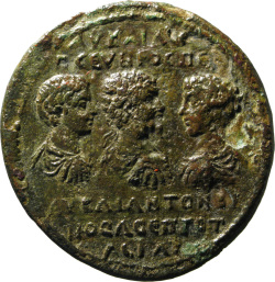 laureate, draped and cuirassed bust of Septimius Severus, right, seen from rear, between bare-headed, draped and cuirassed busts of Caracalla and Geta
