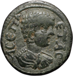 bare-headed and cuirassed bust of Geta, right, seen from front