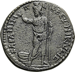 Sarapis standing facing, head left, raising his right hand and holding sceptre; to left, lighted altar
