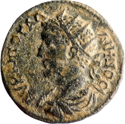 temple with four columns on podium of two steps; beneath arcuated lintel, Tyche standing left, holding rudder and cornucopia