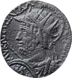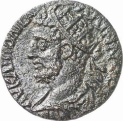 emperor, radiate, standing in facing quadriga holding Nike in left and raising right