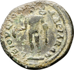 Zeus standing facing, holding thunderbolt; at his feet, eagle
