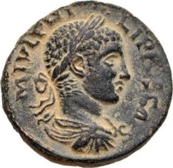 Fortuna standing facing, holding rudder and cornucopia, crowned by Victory standing on column; at feet, Marsyas standing right; below, on left, Philip I and Philip II standing right, holding patera and sceptre; between them, lighted altar