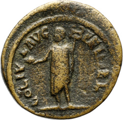 Fortuna standing facing, holding rudder and cornucopia, crowned by Victory standing on column; at feet, Marsyas standing right; above, caduceus; at right, thunderbolt