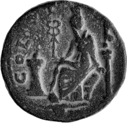Ceres and Proserpina (?), standing, facing each other, holding ears of corn and sceptre entwined by serpent; between them, serpent raising from altar and caduceus