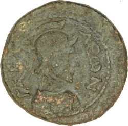 to right, bust of Athena wearing helmet and aegis, left; to left, Astarte seated facing, wearing polos; on each side of Astarte, a sphinx, facing