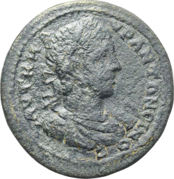 laureate, draped and cuirassed bust of Elagabalus, right, seen from front