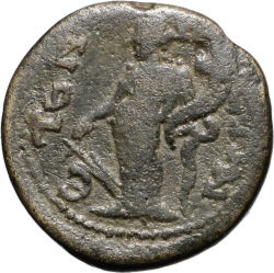 Tyche standing facing, head left, wearing kalathos, holding cornucopia and rudder