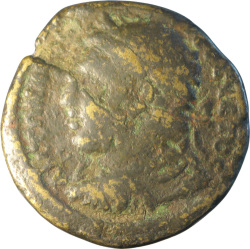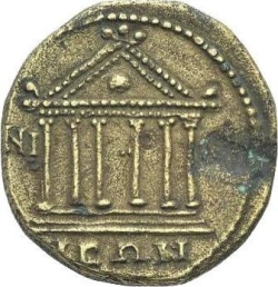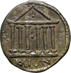 temple with six columns on podium, with pellet in pediment, within which Tyche standing left, holding rudder and cornucopia