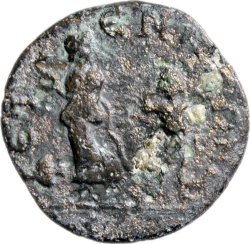 male figure standing nude, facing, head left, holding short sceptre(?), cloak and raising hand