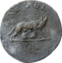 she-wolf standing right, head left, suckling the twins Romulus and Remus