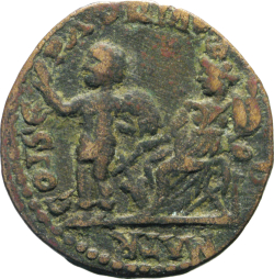 Tyche seated facing holding rudder in right hand and cornucopia in left