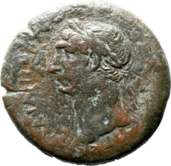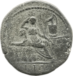 Galley with oars, left; Sarapis seated facing, head left, holding sceptre; to left, Isis Pharia standing left; to right, Demeter standing left, holding torch and cornucopia