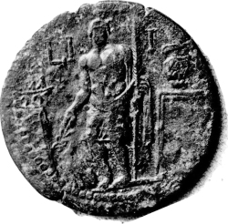 Heracles standing facing, head left, holding sickle, and branch and lion skin