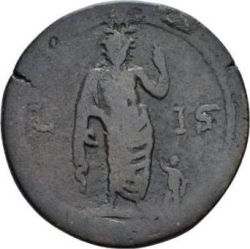 Isis, crowned with disc, horns and plumes, seated, right; on knee, Harpocrates, crowned with skhent, raising hand
