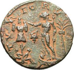 Heracles-Melqart standing nude, left, holding club and placing hand on trophy before him, crowned by Nike standing on small column behind him; at his feet, murex shell
