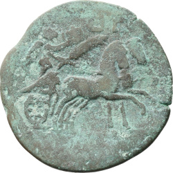 Nike in biga, right, holding wreath and palm-branch