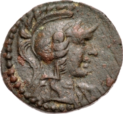 Athena standing left, holding transverse spear in right and shield in left; before, olive tree