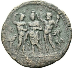 Sarapis seated, left; to left, small Harpocrates standing facing, raising hand; to right, Hermanubis standing, right, holding palm-branch and sceptre (?)
