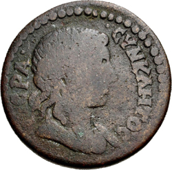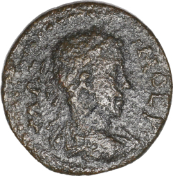 Mên standing, facing, wearing Phrygian cap and crescent on shoulders, holding sceptre(?) and pine cone