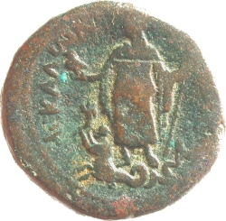 temple with four columns and rounded pediment enclosing statue of turreted Fortuna/Tyche-Astarte standing with foot on uncertain object, left, holding human bust and long sceptre