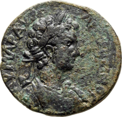 three temples side by side, each one surmonted by a wreath; on the left, temple with six columns, ΑΥ on the pediment, enclosing statue of Augustus standing right; in the center, temple with four columns, ΑΝ on the pediment enclosing statue of Asclepius (as Caracalla) seated left, holding serpent and sceptre; on the right, temple with six columns, ΤΡ on the pediment, enclosing statue of Trajan standing left