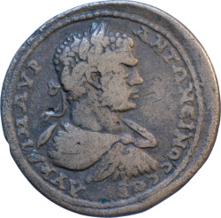 laureate and cuirassed bust of Caracalla, right, seen from front, with gorgoneion on cuirass