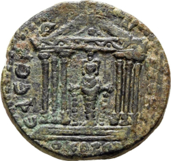 two temples with six columns, seen from front; the one on the left enclosing a cult-statue of the Emperor, the one on the right a cult-statue of Zeus Nikephoros
