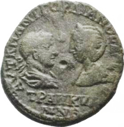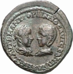 confronted busts of Gordian III, laureate, draped and cuirassed, right, seen from rear, and Tranquillina, diademed and draped bust, left