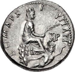 Tyche of the City, turreted and veiled, seated, left, on diphros, holding palm and cornucopia; at her feet, river god Kydnos, crowned with sedge, swimming, right