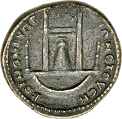 temple of Aphrodite at Paphos, in which canonical xoanon; paved semicircular walled courtyard; garland between two antae; star on either side of xoanon; candelabrum on each side of building
