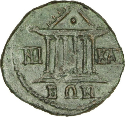 front view of temple with six columns, within which Emperor(?) standing facing, holding spear(?)