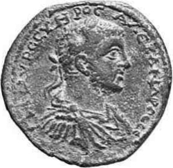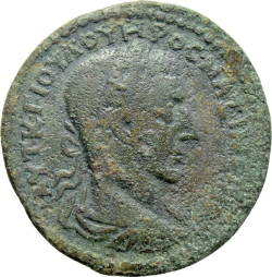 bare-headed, draped and cuirassed bust of Severus Alexander, right, seen from front