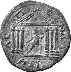 front view of temple with six columns with arcuated lintel, within which Mên(?) standing, left, wearing a Phrygian cap, holding spear(?) and uncertain object