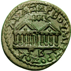 front view of temple with six columns, within which Emperor standing facing, head left, holding spear and patera (over altar?); in pediment, wreath(?)
