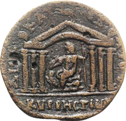 front view of temple with six columns with arcuated lintel, within which statue of Zeus Katabaites seated on rock, left, holding sceptre and thunderbolt (?); at his feet, eagle, left, looking back; above, bull leaping left