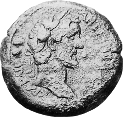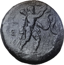bust of Heracles, wearing lion skin, club over shoulder, and draped bust of Hermes, crowned with lotus, jugate, right; before, winged caduceus