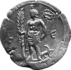Hermanubis standing, left, head, right, wearing kalathos, holding caduceus downwards and palm-leaf