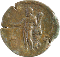 Heracles standing, facing, head, left, holding apples and club, lion skin over arm