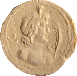 draped bust of Hermanubis wearing kalathos, right; before, palm-branch